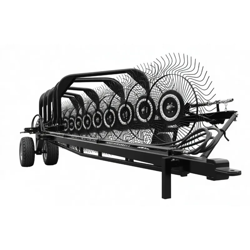 The fundamental working principle of the 9LZY-9.0 relies on the friction between the ground and the spring tines to induce rotation in the finger wheels. This ground-driven mechanism is elegantly simple yet highly effective. As the rake is towed forward, the angled orientation of the wheels causes them to spin, sweeping the forage laterally from one wheel to the next until it is deposited into a windrow. The material selection for the tines is critical; we utilize specialized 65Mn spring steel, heat-treated to acahieve a specific elasticity that allows the tines to flex over stones and uneven ground without deforming or breaking. The main frame is constructed from Q345 high-strength structural steel, providing the rigidity needed to support the 15-wheel assembly over a 9-meter span without sagging. The hydraulic cylinders are precision-machined with hard-chrome plated rods to resist corrosion and wear from dust and debris common in haying environments. This metallurgical attention to detail ensures that the disc-type hay rake parts have a long service life, reducing the total cost of ownership.